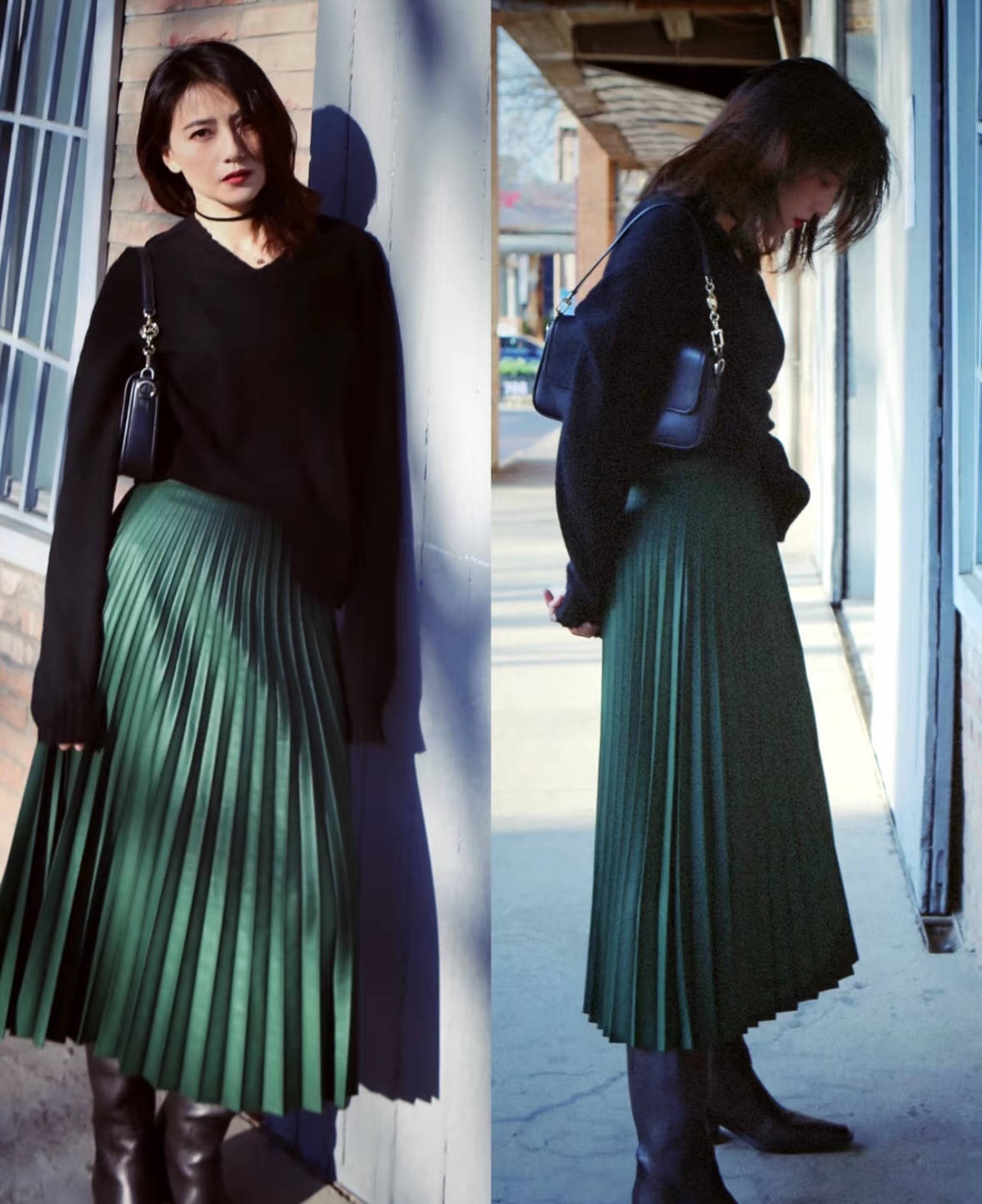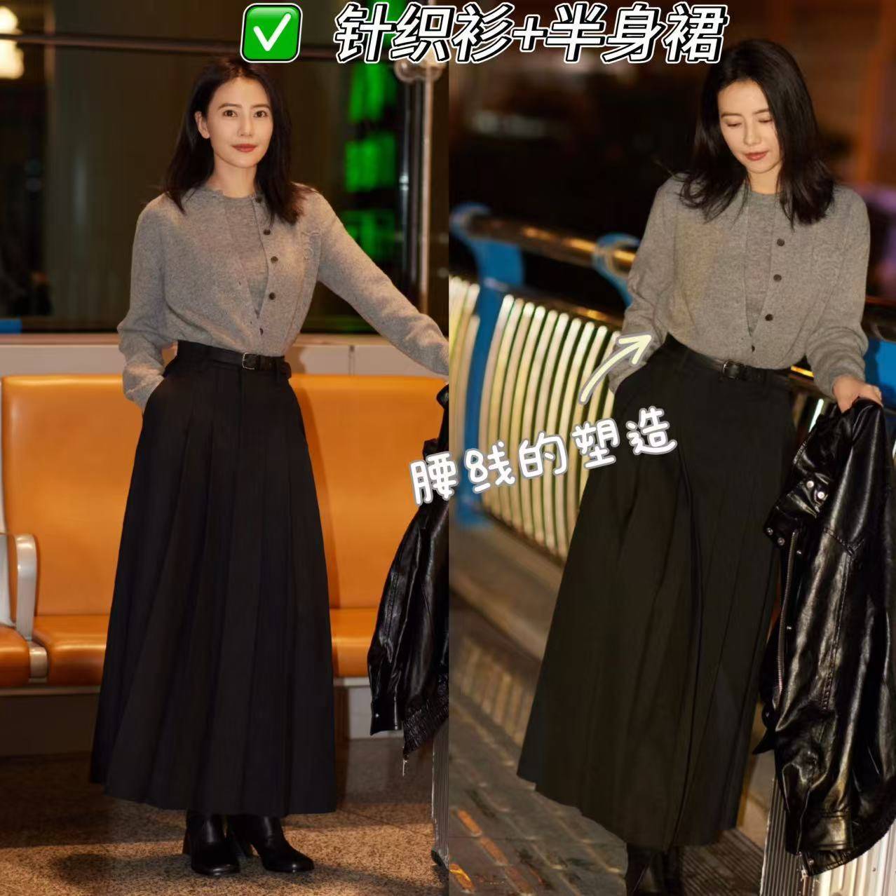 穿搭示范:灰色针织衫+黑色半身裙