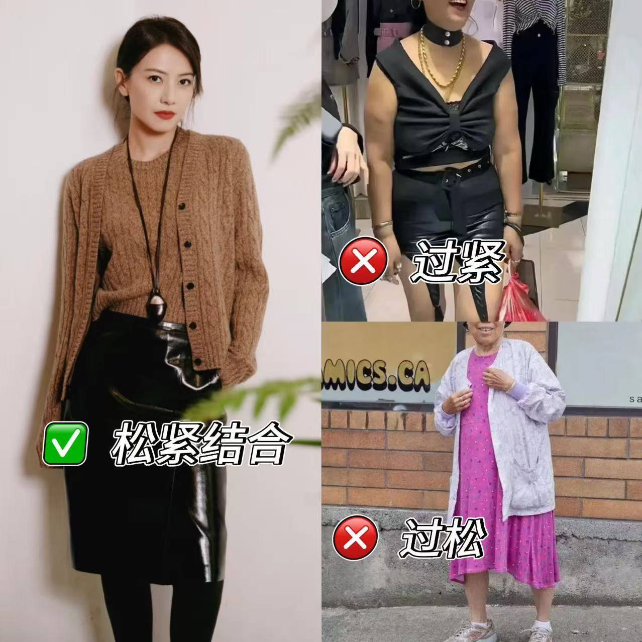 说实话,女性到中年会发福,身材会走样,太紧的穿搭会暴露身材焦虑,太宽显得邋遢没精神,合身略有余量才是最佳状态,像高圆圆这套要针织衫搭配皮半裙,松紧结合的搭配,既能修饰身材又能保持得体。