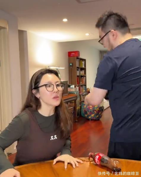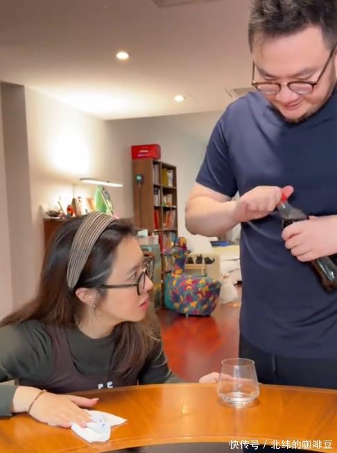 他和妻子两人在家中拍摄了一个搞怪视频,他准备扭开一瓶可乐而妻子正在擦桌子, 妻子穿着一件绿色的打底衫外面穿着一件咖色的小马甲,双眼紧紧的盯着可乐。