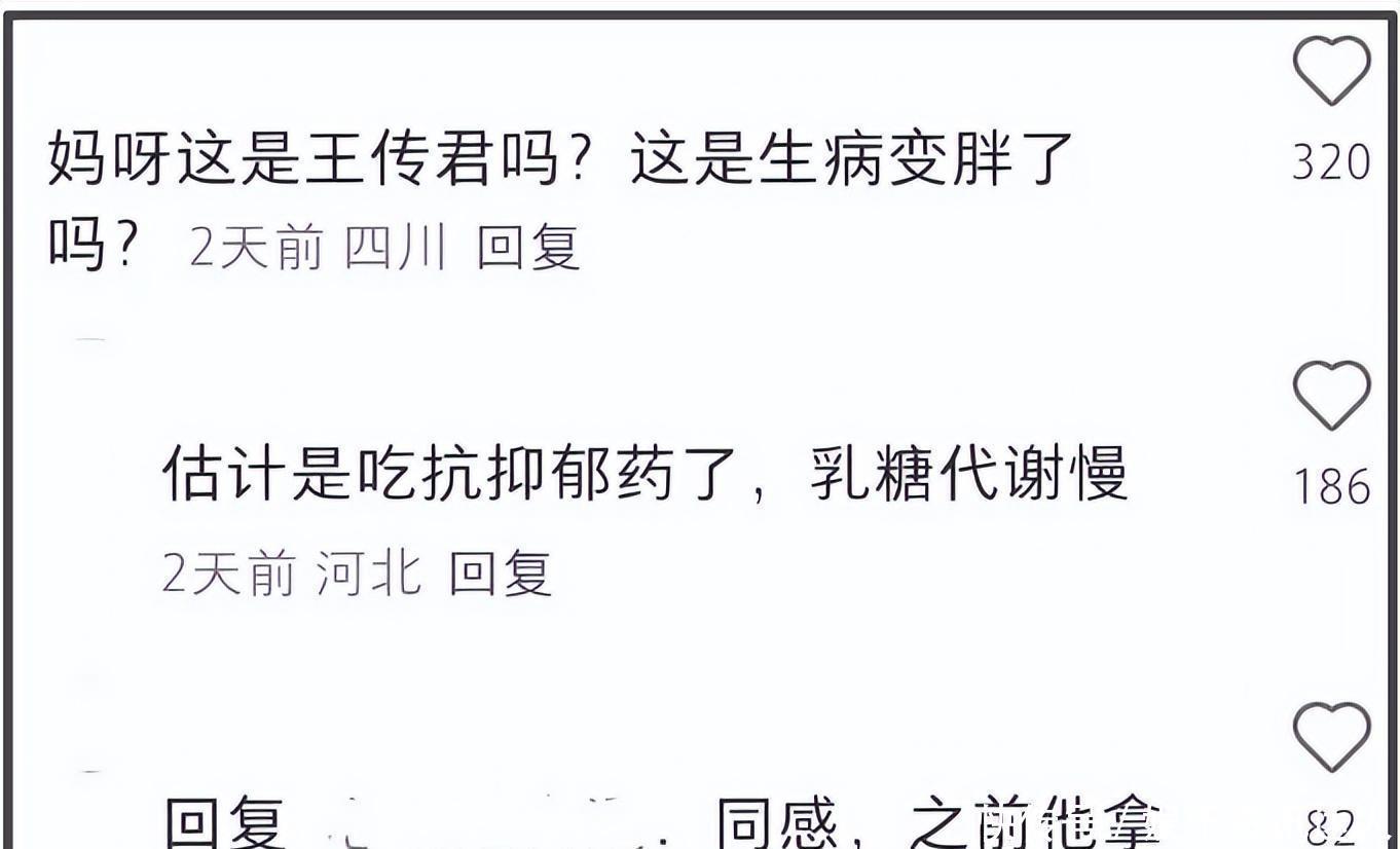 其实王传君自己之前说过,他因为身体“亚健康”退出了《千里江山图》剧组。当时好像谁也没想到问题会发展这么快,网友看到照片很多人开始猜测,有说他为新角色疯狂增肥,也有说是不是吃了什么激素药,甚至有抑郁症病友站出来讲自己吃药后也这样胖得特别突然。还有的网友分析他四肢细、腰腹粗,看上去“充气型”的发胖像典型向心性肥胖,这种多半和药物激素或者某些疾病有关。